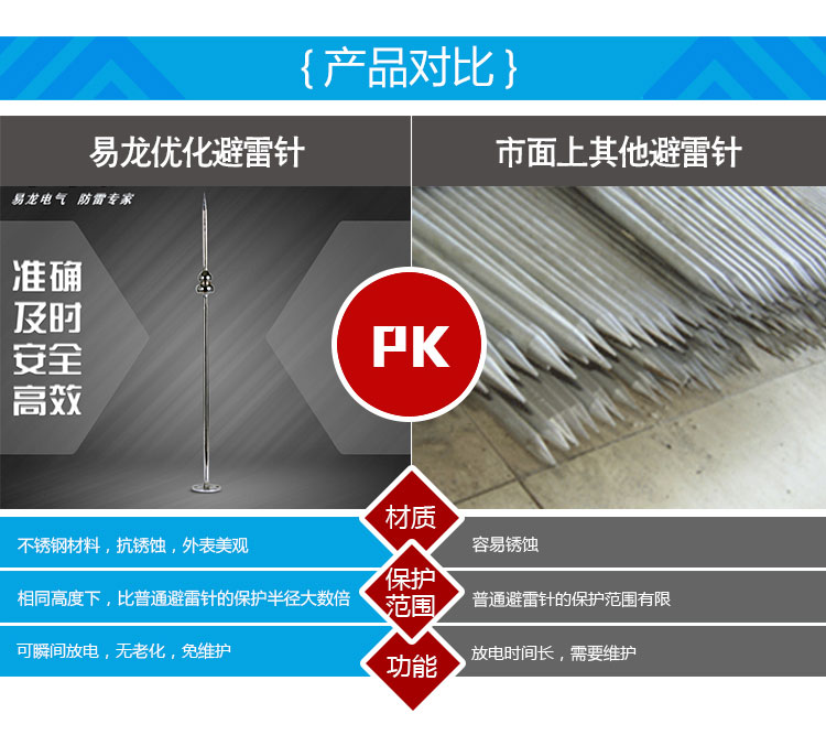 EPE系列提前放電避雷針(以下簡稱EPE避雷針)采用法國技術(shù),符合法國NFC17-102標(biāo)準(zhǔn)。它由三種系統(tǒng)(大氣電力電容器、高壓脈沖發(fā)送系統(tǒng)、電流泄放系統(tǒng))組成,具有雙重瞬間放電裝置,被多層的具有隔絕惡劣環(huán)境及水密性的材料所保護(hù);無老化危險,免維護(hù)。在相同的安裝高度下,比普通瞬間避雷針的保護(hù)半徑大數(shù)倍,搶先放電時間為30μs~60μs,即優(yōu)先引雷入地。