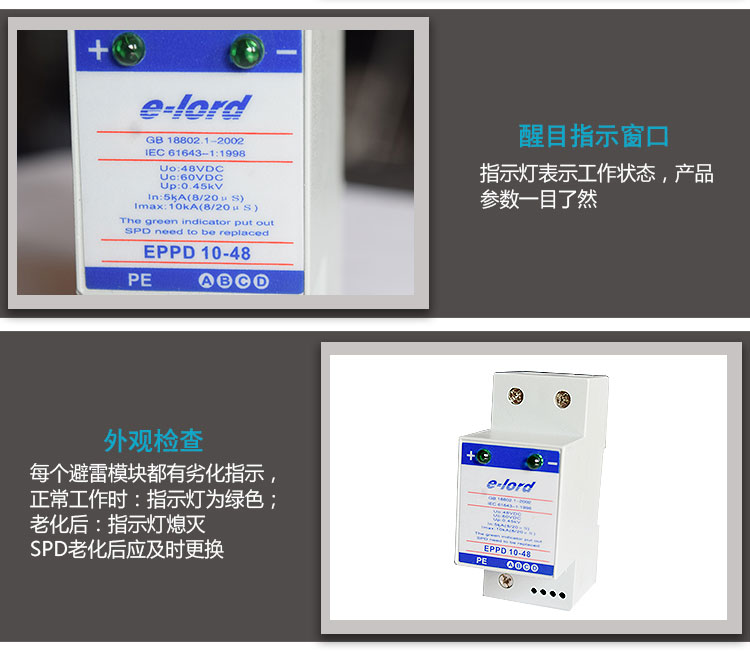 EPPD系列低壓直流型電源SPD是單體電源防雷模塊,防止感應過電壓或操作過電壓對低壓交流用電設備的損壞。