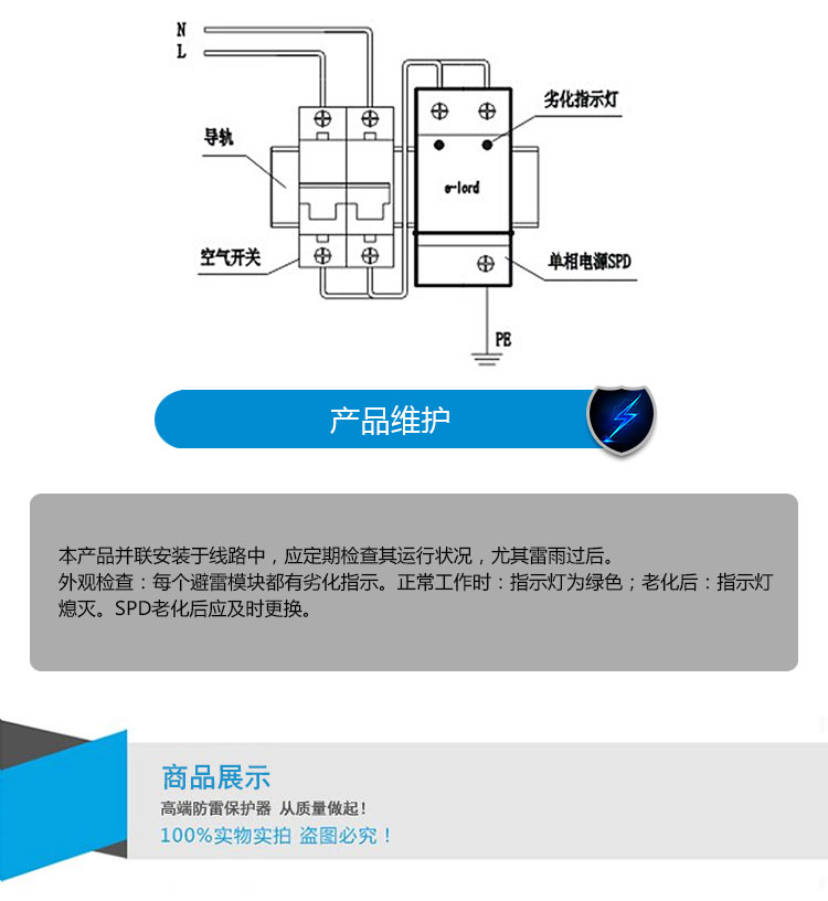 1. 已有可靠接地系統(tǒng),在配電柜(避雷器安裝處)的接地樁 (條)上進行接地電阻的測定,電阻應(yīng)符合相關(guān)規(guī)范要求。 (或滿足國家、部級標(biāo)準(zhǔn))。 2. 配電柜中應(yīng)留有安裝避雷器的空間, 注:L為電源相線;N為電源零線;PE為地線。 | 應(yīng)檢查空氣開關(guān)已經(jīng)合閘導(dǎo)通,以保證避雷器處于運行狀態(tài); 不要在雷雨天安裝。 |