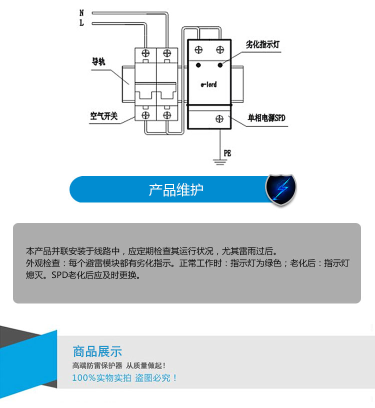 1. 已有可靠接地系統(tǒng),在配電柜(避雷器安裝處)的接地樁 (條)上進(jìn)行接地電阻的測定,電阻應(yīng)符合相關(guān)規(guī)范要求。 (或滿足國家、部級標(biāo)準(zhǔn))。 2. 配電柜中應(yīng)留有安裝避雷器的空間, 注:L為電源相線;N為電源零線;PE為地線。 | 應(yīng)檢查空氣開關(guān)已經(jīng)合閘導(dǎo)通,以保證避雷器處于運行狀態(tài); 不要在雷雨天安裝。 |